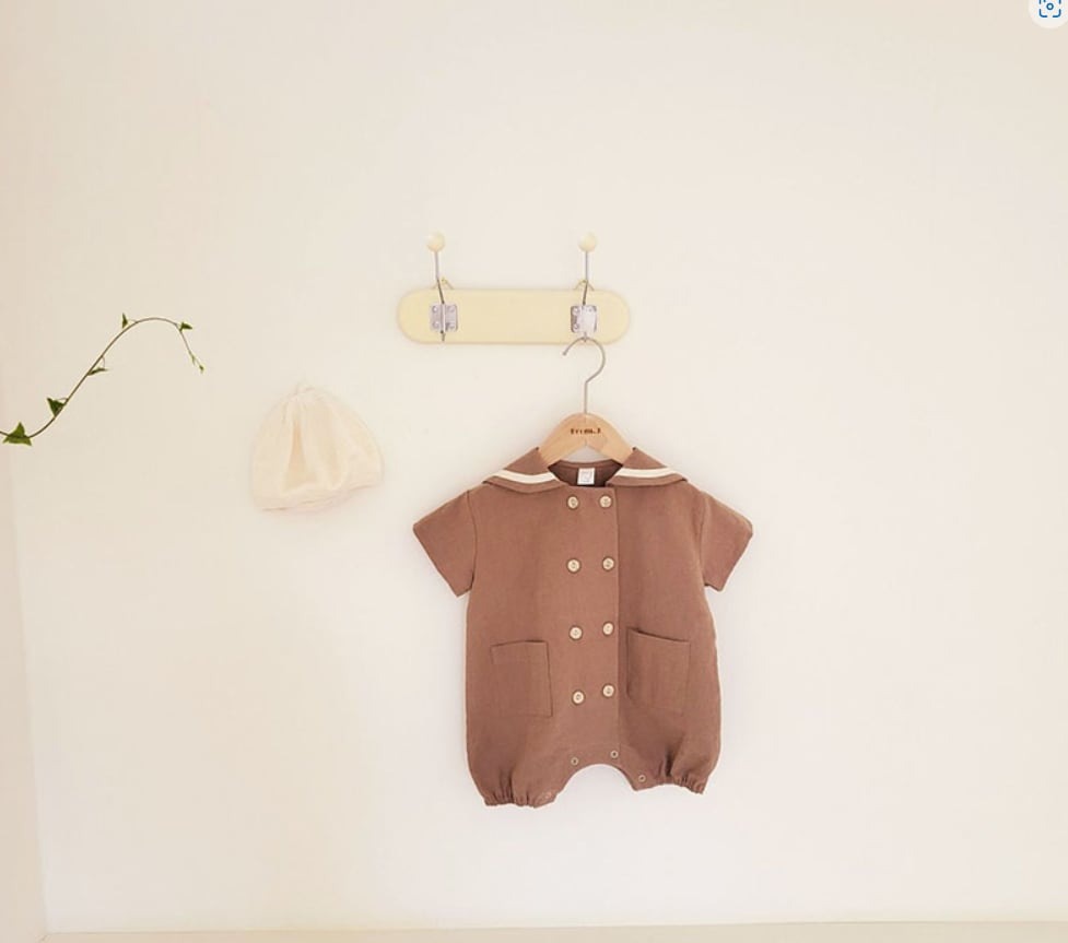 ダブルボタンが特徴のセーラーロンパースです。